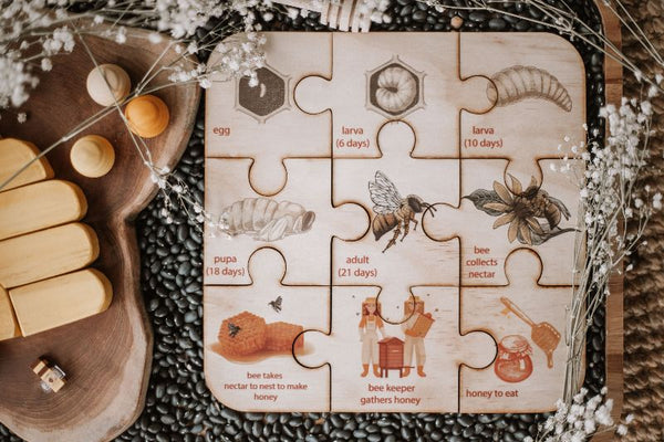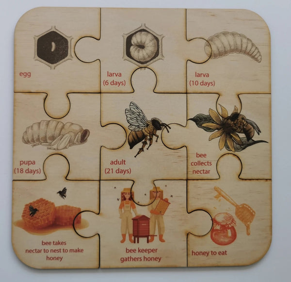 This simple 9 piece puzzles feature beautiful vibrant images of the Australian Honey Bee Lifecycle, as well as their name. They are a great introduction for young children to the lifecycle of the honey bee, some of which they might already be familiar with, as they can be found in or around our neighborhoods and towns.