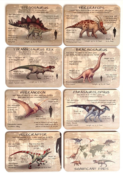 Cards include: Stegosaurus, Triceratops, Tyrannosaurs Rex, Brachiosaurus, Pterandom, Parasaurolopus, Veloraptor and Significant finds.