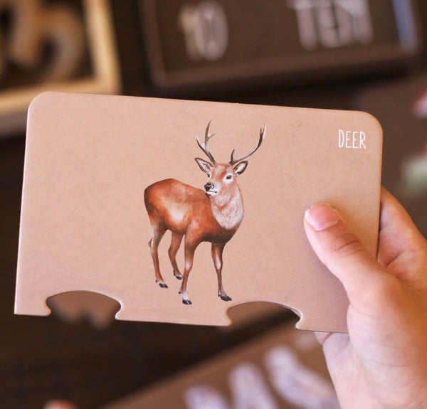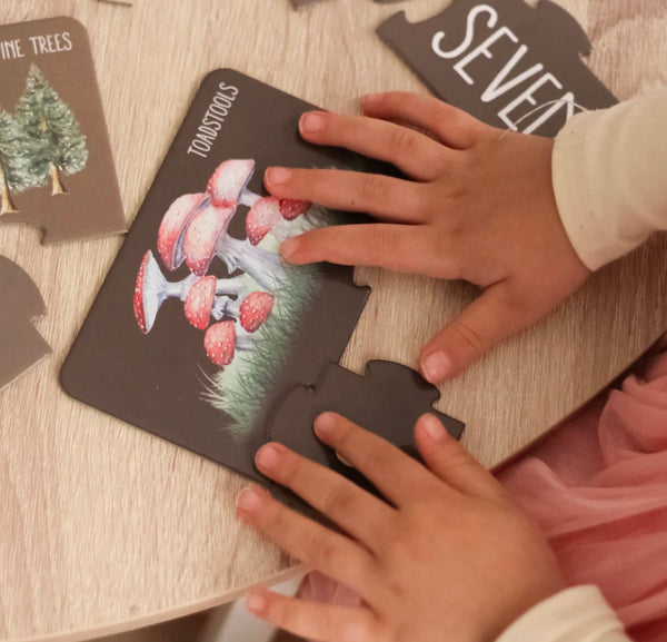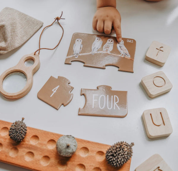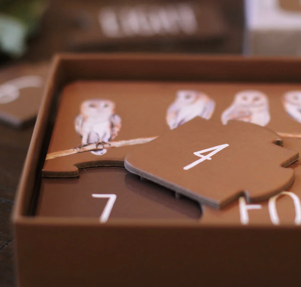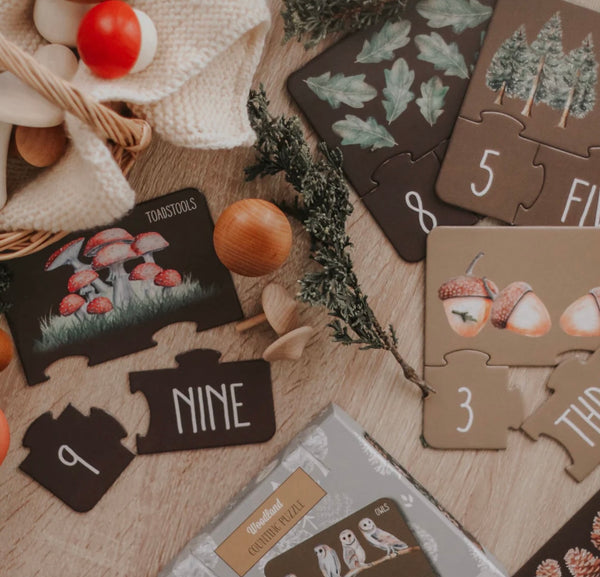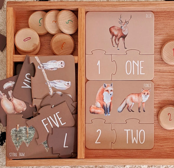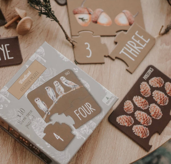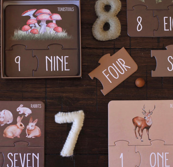 Our Woodland Counting Puzzle includes 10 x 3 piece puzzles packaged in a beautiful box. The puzzle pieces themselves are made of recycled materials and are premium quality for durability and longevity.