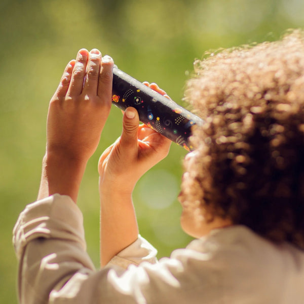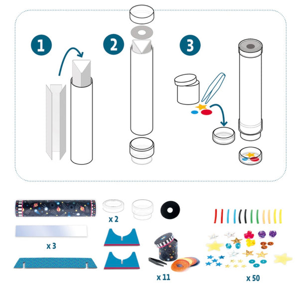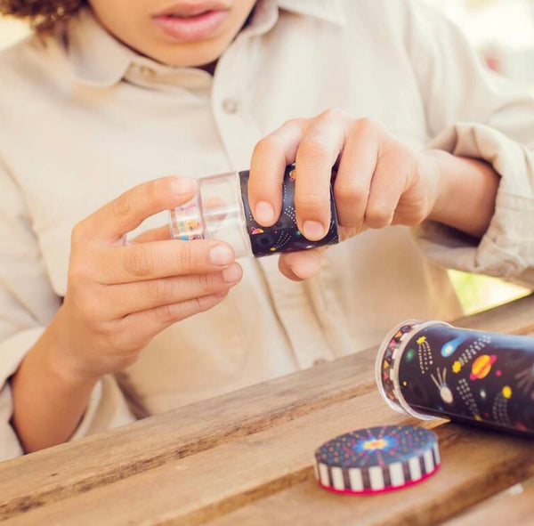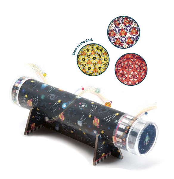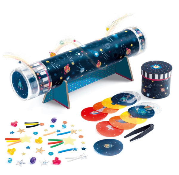 Create an intergalactic space-themed kaleidoscope with 11 different patterns that includes; a glow-in-the-dark option, shiny imitation gems, coloured beads and space themed illustrations. Comes with a storage box for tidy and easy storage.