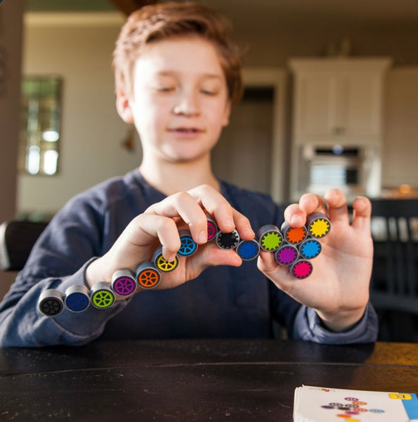 Get your mental gears spinning with these 4 brain-busting puzzles! Bend, rotate, and shape Coggy to match the patterns printed on the challenge cards. Each gear shifts up to 255 degrees and you can feel them click satisfyingly into place. Meanwhile, colored gears on one side, black and white gears on the other, and 4 levels of difficulty keep kids challenged and captivated as they go. Feeling antsy? Coggy also makes an excellent fidget toy. Includes 40 challenge cards. Ages 6 years