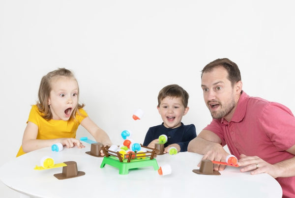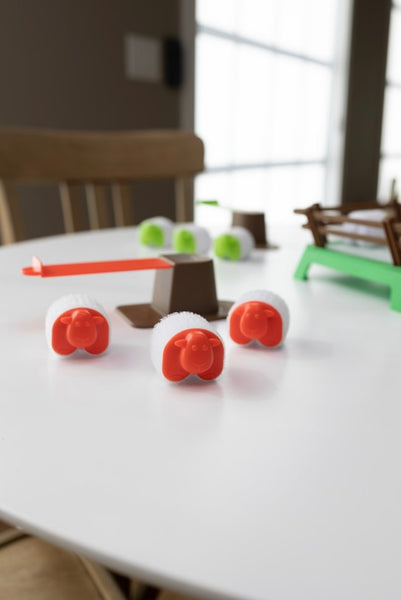 Taking turns, players use their springboard to launch their sheep onto the hook-and-loop paddock. Each sheep is covered with hook and loop fabric. Plan your approach, aim right, then - Land them, stick them, and pile 'em up! The first to get all of their sheep to stay in the field wins the game! Forget sheep-herding and discover the thrill of sheep-launching with the fast and fun game of Heap-O-Sheep.