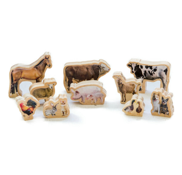 A beautifully crafted toy set consisting of 10 high-quality wooden animals. Brilliant for encouraging role play and story-telling to help develop language skills while supporting creative play. This toy farm set includes a horse, cow, chicken, pig, dogs, and so much more. Each solid wood animal is smooth and lightweight, designed to be easily grasped by little fingers. Images are printed using non-toxic heat transfer technology and sealed with a clear matt varnish to ensure they last for years to come!