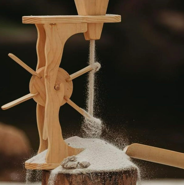 This wonderful timber resource is so open-ended with multiple uses! Children get so much joy as they pour water into the funnel and see the wheel delightfully spin around! Not only can it be used with water but also dry fine sand works amazingly too! The funnel at the top can be removed so children can experiment with pouring other loose grains to investigate what causes the wheel to spin. The Wooden Wheel can also be placed in a small stream between two sticks and it keeps spinning as the water rushes by!