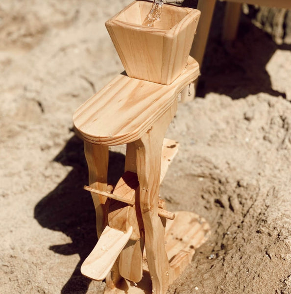 Let the fun and play begin with this crafted wooden wheel which can be used with water or fine sand!