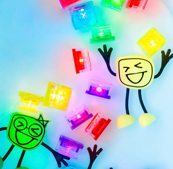 Perfect for sensory play, water play and bath time! Put them in water and watch them light up. Then shake them off, dry and place on side. Each pack comes with 4 light-up cubes and there are 6 colours to choose from.