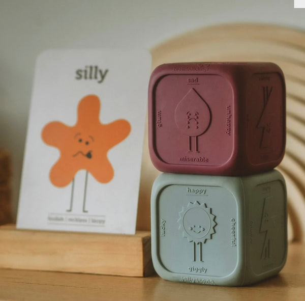Born out of a collaboration between Two Little Ducklings and Jellystone Designs, the Feelings Cube is designed to help little ones express themselves through play! Each side contains a different textured visual illustration of emotion plus 4 different synonyms for that emotion. This is a great and fun way to help little ones develop the vocabulary to articulate their big emotions!