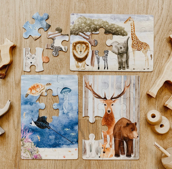 These puzzles come in a pack of three, woodland, safari and ocean. They are a twelve piece puzzle measuring 19cm by 13cm. They are printed on thick cardboard with a gloss finish and come in a sturdy custom designed box. They are printed and made here in Australia.