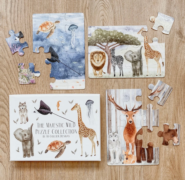 Introducing The Majestic Wild puzzle collection. A trio of beautiful twelve piece puzzles featuring some of your favourite majestic creatures from all around the world. Venture on a safari, dive into the ocean and take a stroll through the enchanted forest. Teach your little one to learn through play and develop motor skills, hand-eye coordination, problem solving and shape recognition.