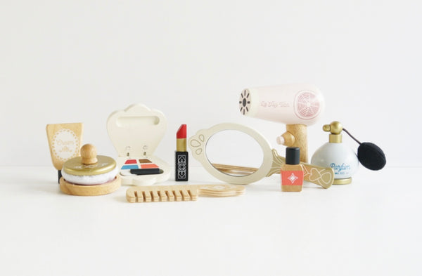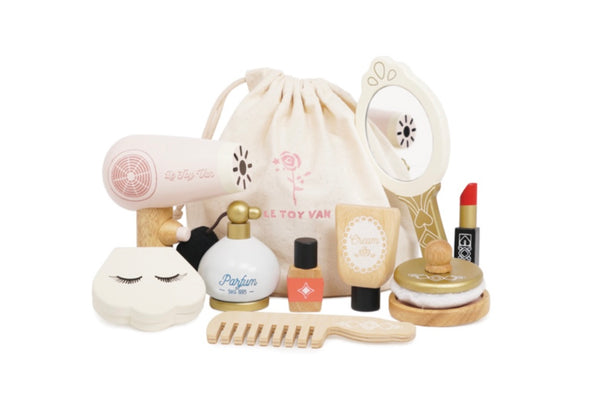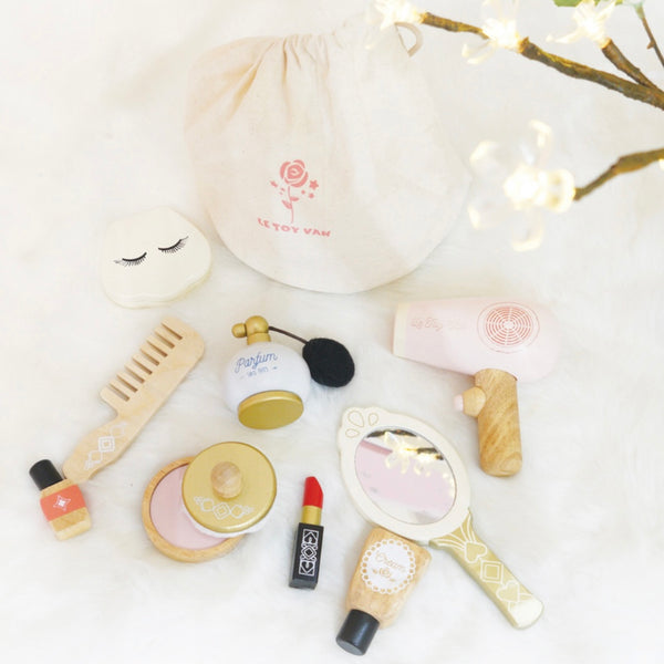 Inside this stunning cosmetic bag, you will find an assortment of wooden beauty accessories. Children will love role-playing with