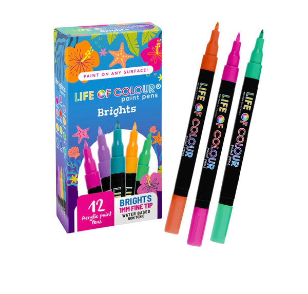 Bright Colours 1mm Fine Tip Acrylic Paint Pens - Set of 12