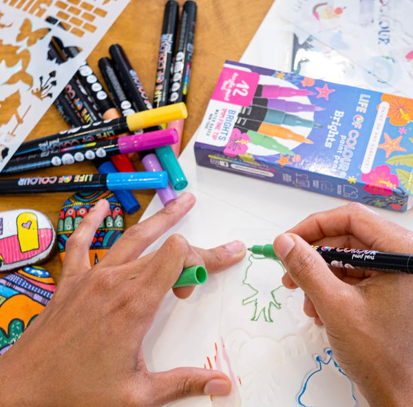 - They are a set of 12 fine 1mm tip, Bright colour acrylic paint pens to use on ANY surface!!!(eg. rocks, pots, clothes, leaves, tin, glass, paper, wood, canvas, polymer clay etc.)