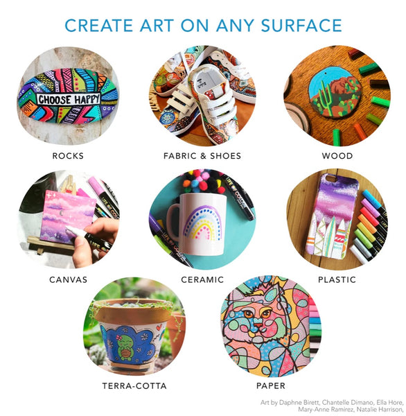 - They are a set of 12 medium 3mm tip Pastel colour acrylic paint pens to use on ANY surface! (eg. rocks, pots, clothes, leaves, tin, glass, paper, wood, canvas, polymer clay etc.)
