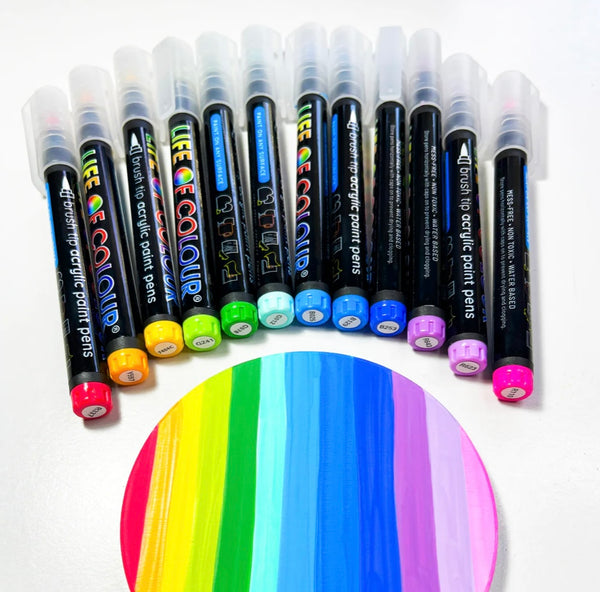 - Filled with highly pigmented acrylic paint, the colours flow smoothly out of the pen and through the brush tip onto any surface you can think of.