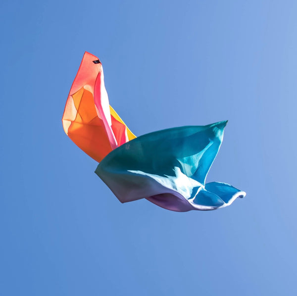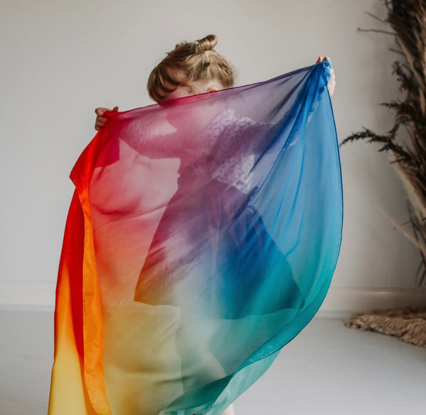 Play silks, a staple in any playroom. These wonderful toys may not seem like a ‘toy’ but put them in the hands of a child and what will emerge can be surprising. There are so many ways to play with this simple toy that is only limited by imagination.