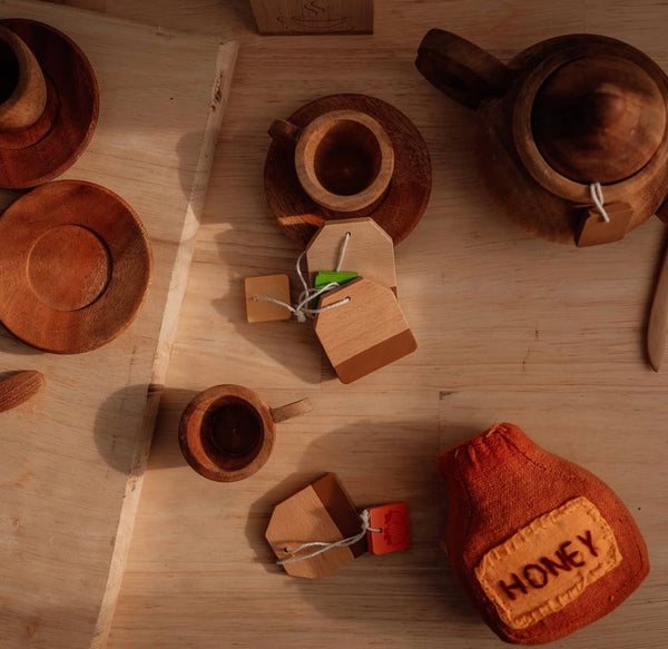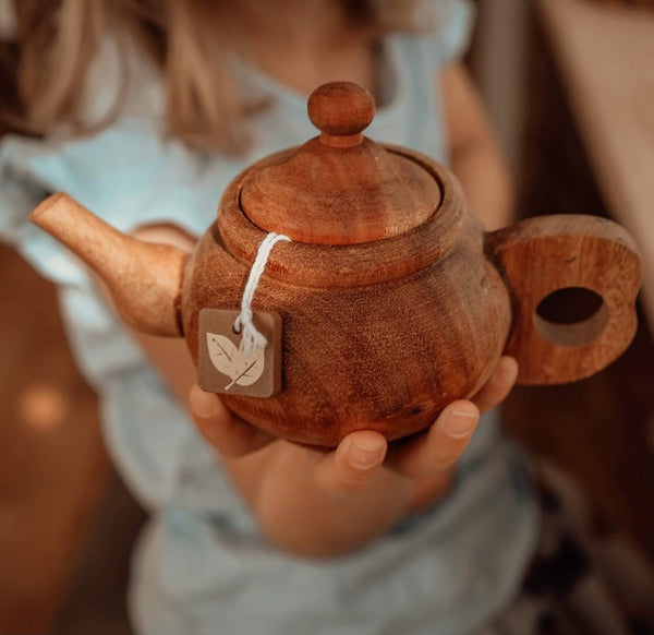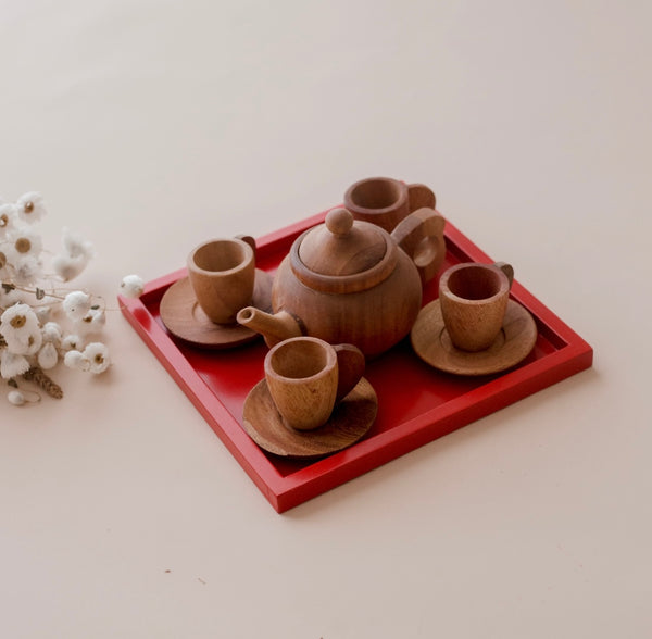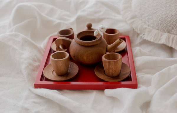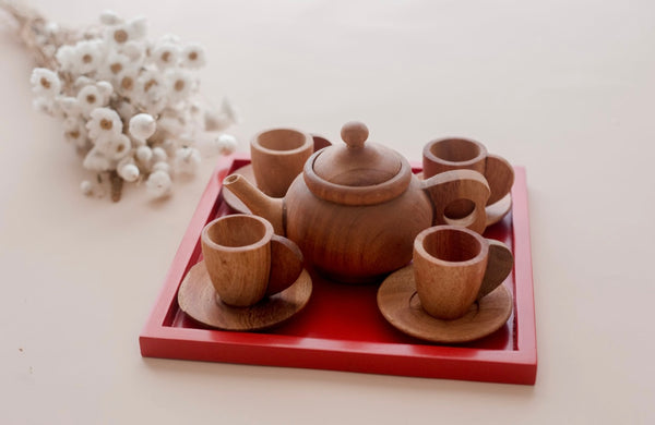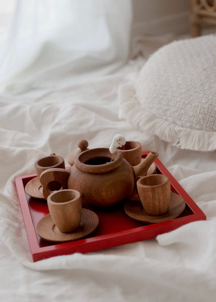 Beautiful mahogany wooden tea set with four cups and four plates, perfect for any playroom! Beeswax finished. Mahogany trees are grown around Rubber plantations to protect the young rubber trees, and they are harvested around 10 to 15 years. The timber of these trees is used to make these beautiful products. All materials used are child-safe and non-toxic.