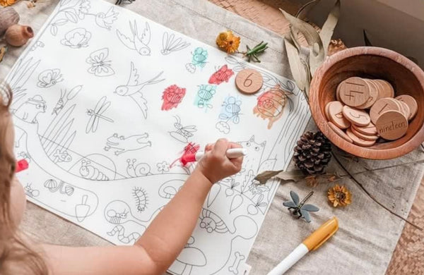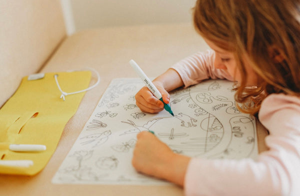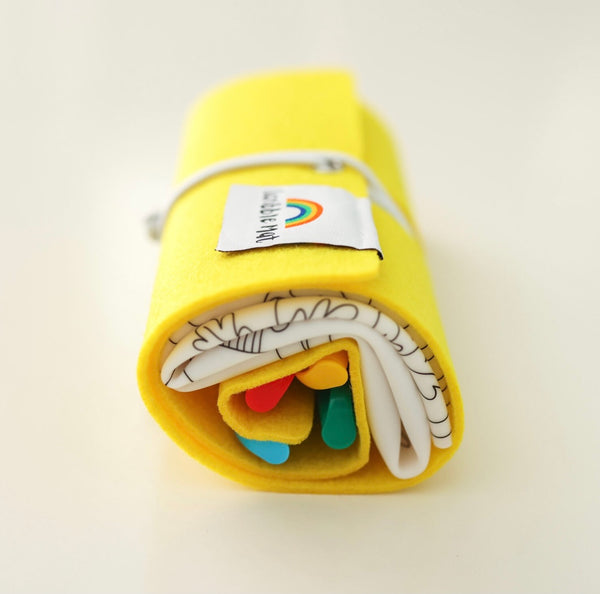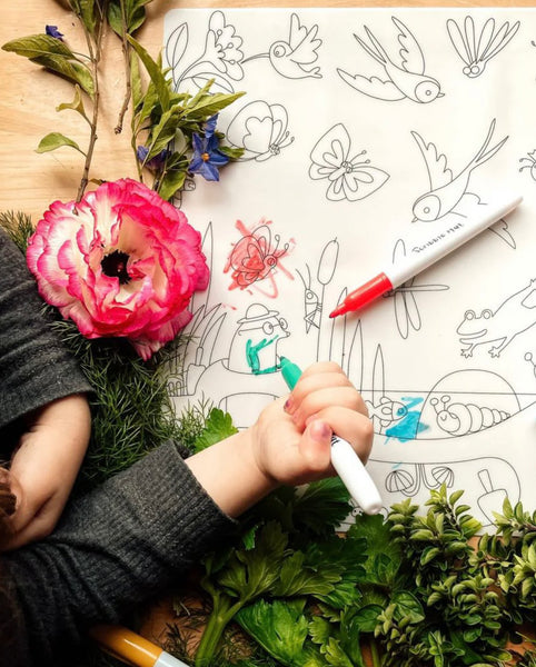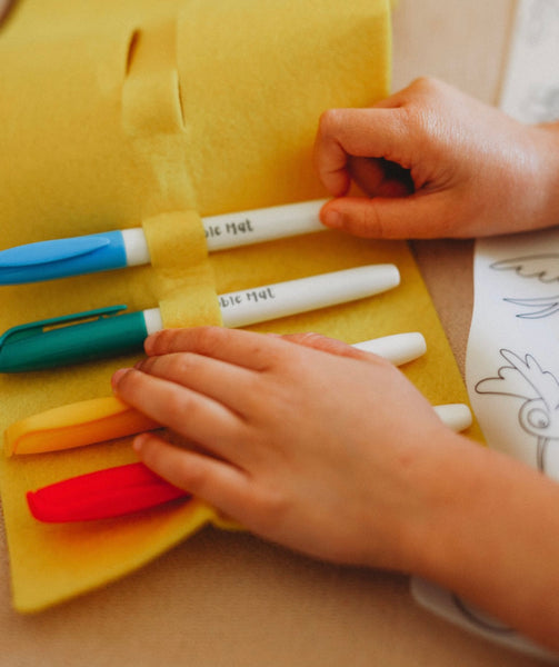 One “In the garden” mat, four pens and a yellow felt storage pouch. These pens are specially designed to be used only for these silicone mats. If used incorrectly they may stain areas off the mats and little ones clothes. Please supervise your child’s use of the pens.