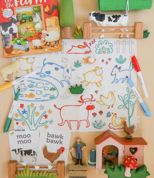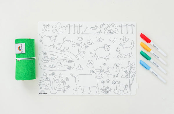 “On the farm” mat, four pens and a green storage felt pouch. These pens are specially designed to be used only for these silicone mats. If used incorrectly they may stain areas off the mats and little ones clothes. Please supervise your child’s use of the pens.