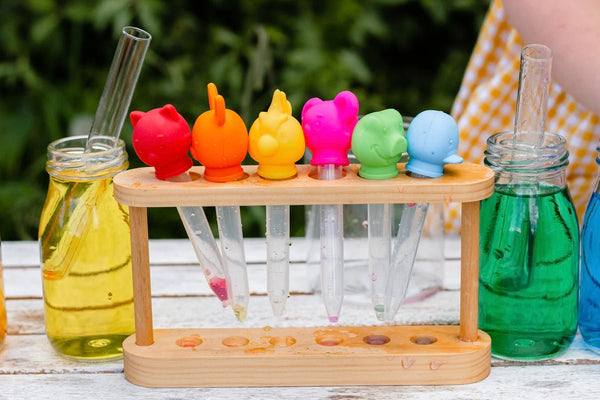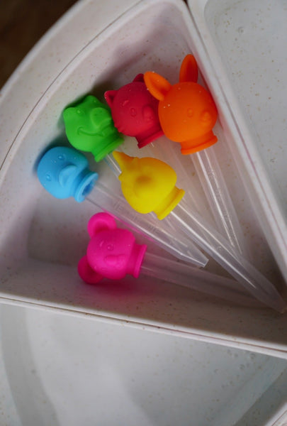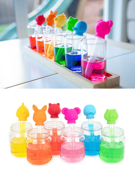 Made from soft and colourful silicone, these 6 animal themed squeezable droppers are perfect for building fine motor skills with hands on colour mixing activities, simple STEAM experiments or good old fashioned water play at home