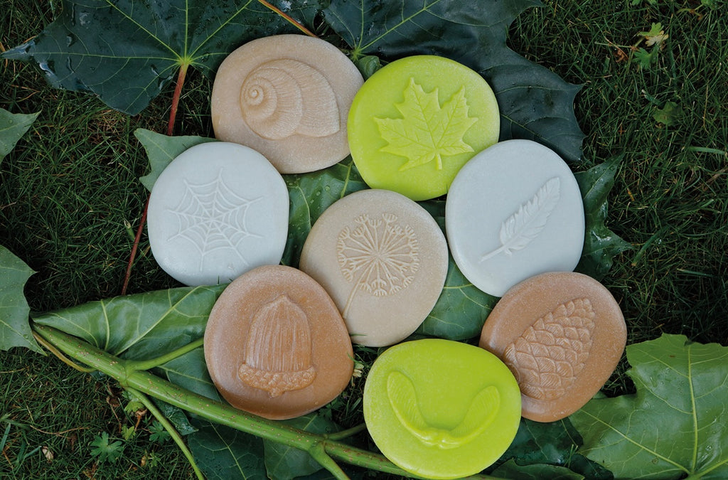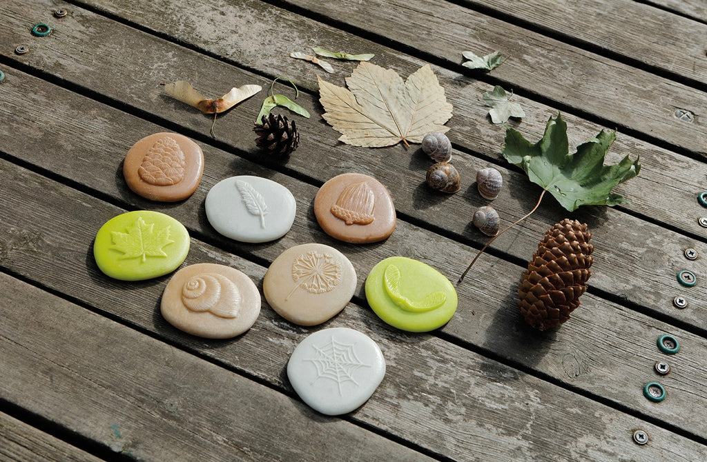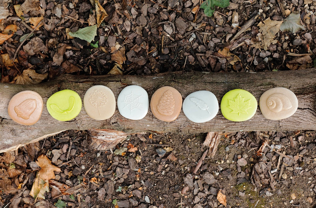 Set contains eight stones: acorn, dandelion seedhead, feather, pine cone, snail shell, spider’s web, sycamore leaf, sycamore seeds. Stones measure approx 80mm. Safe for 2+.