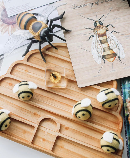 Our felt bees are ethically made by artisans in Nepal. Your child may choose to place them in a container so that it contributes to the play schema.