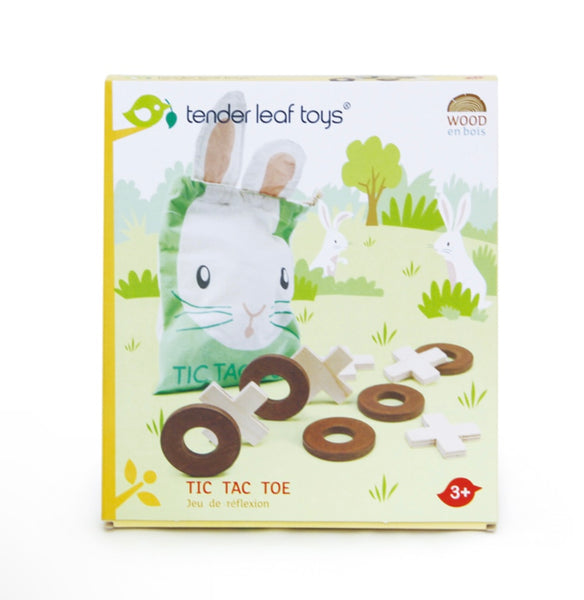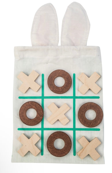 An adorable bunny drawstring bag with tic tac toe printed on the back. Comes with a set of wooden playing x and o's.