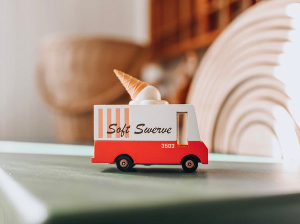 Soft-serving up good looks. As far as a symbol of simpler times and a carefree way to stuff sugar and calories in your childhood, you can’t beat the ice cream truck. We popped a melty top, added a bright pink base, sprinkled a pun, and voila! Iconic toy made. No ice cream truck jingle – you’re welcome.