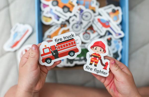 Our brand new set of 20 Vehicle Magnets brings moving vehicles from the air, land and sea to life. Also included are 7 gender professions magnets to build your child's vocabulary.