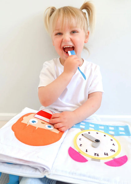 There are 10 interactive pages encouraging hands on learning, including telling time, brushing teeth, lacing shoelaces, unzipping, getting dressed, buckling the dog's collar, preparing food, doing household chores, matching, buttoning and much, much more.