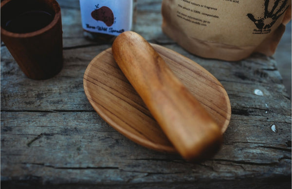 Mix your potions, lotions and pigments on this wooden dish with a wooden pestle.
