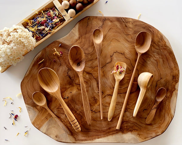 A lovely set of 8 teak spoons children's sensory play. A great addition to children's imagination in measuring and kitchen play